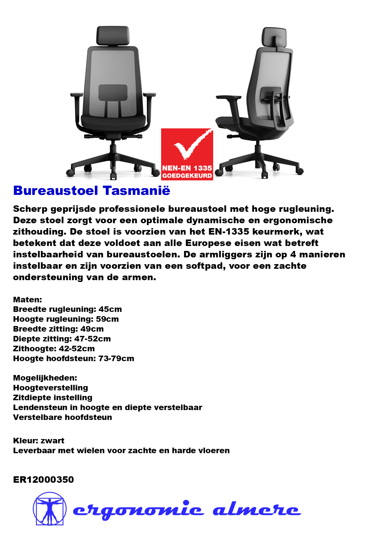 Bureaustoel Tasmanië met verstelbare armleggers